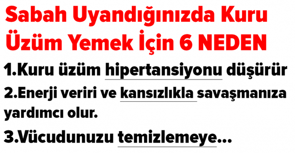 Kahvaltınızı yaparak bir avuç kuru üzüm yemeye başlarsanız ihtiyacınız olan potasyum ve magnezyuma sahip olursunuz.